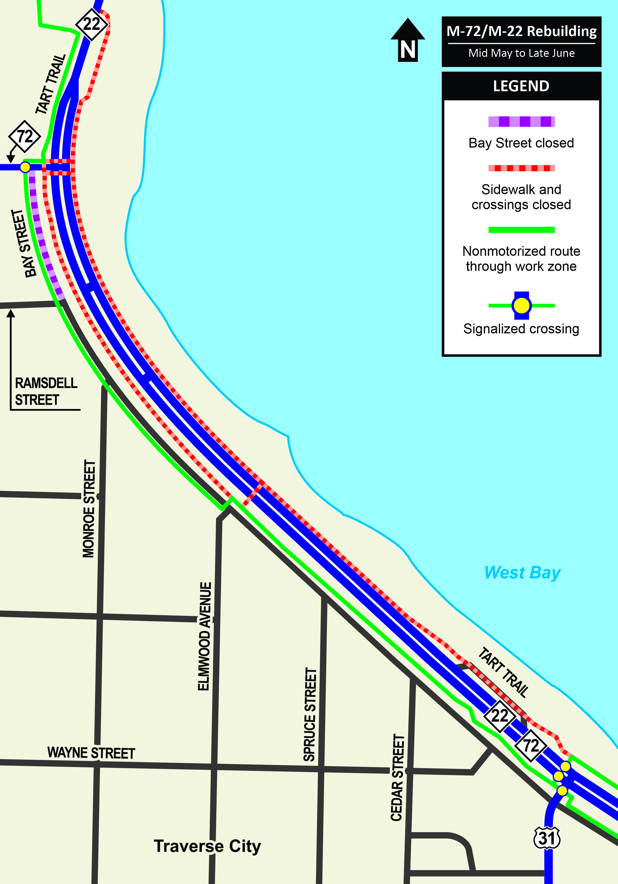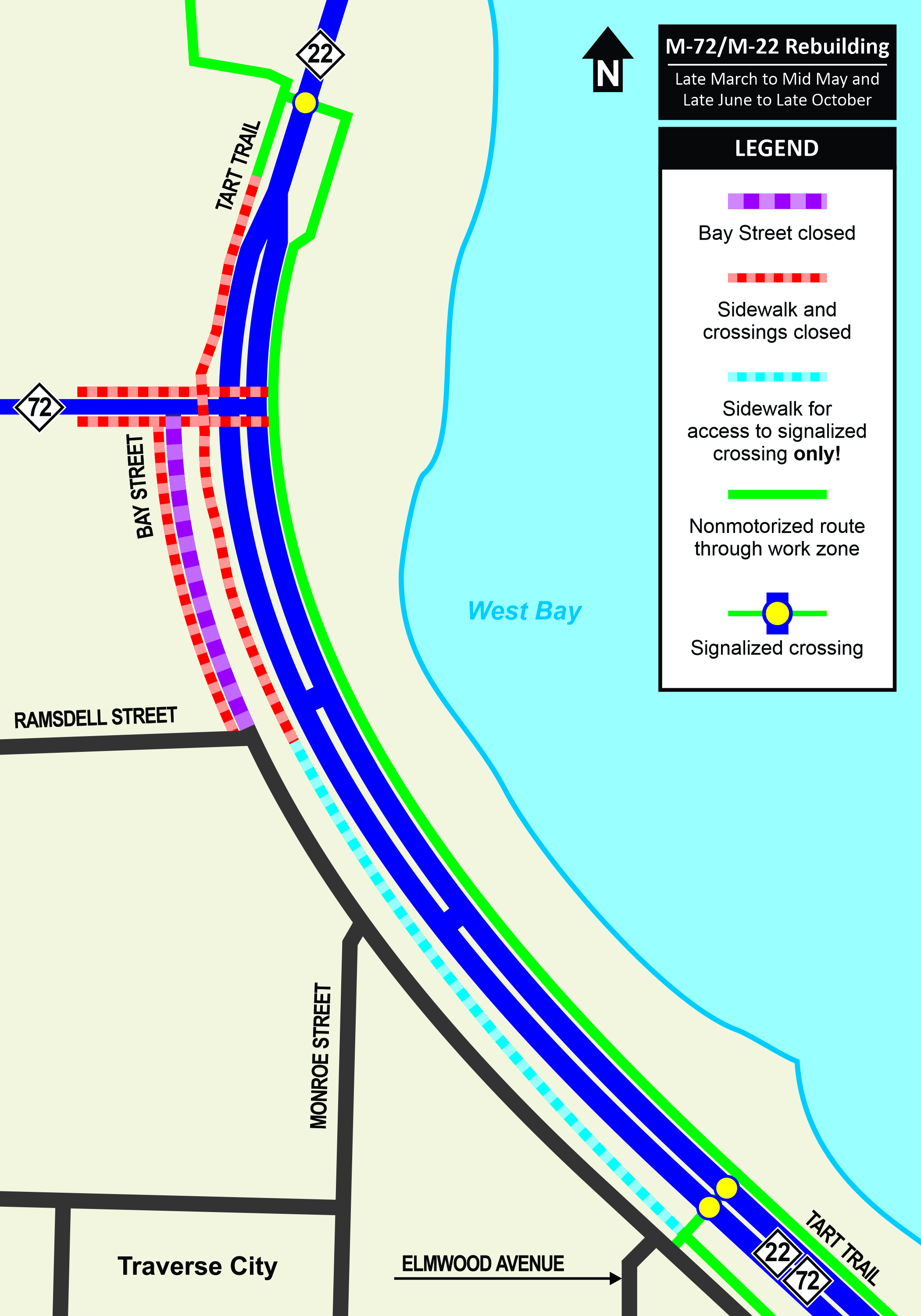 The newly built trail on the bay side will also be open to pedestrian and bicycle traffic. From late June to late October, the TART trail on the west side of M-72/M-22 will be closed from Elmwood Avenue to the Leelanau Trail north of the M-72/M-22 intersection while it is rebuilt. During this time, pedestrians and bicyclists will be directed to the traffic signal at Division Street and the temporary high-intensity activated crosswalk (HAWK) signal north of the M-72/M-22 intersection to cross the highway.