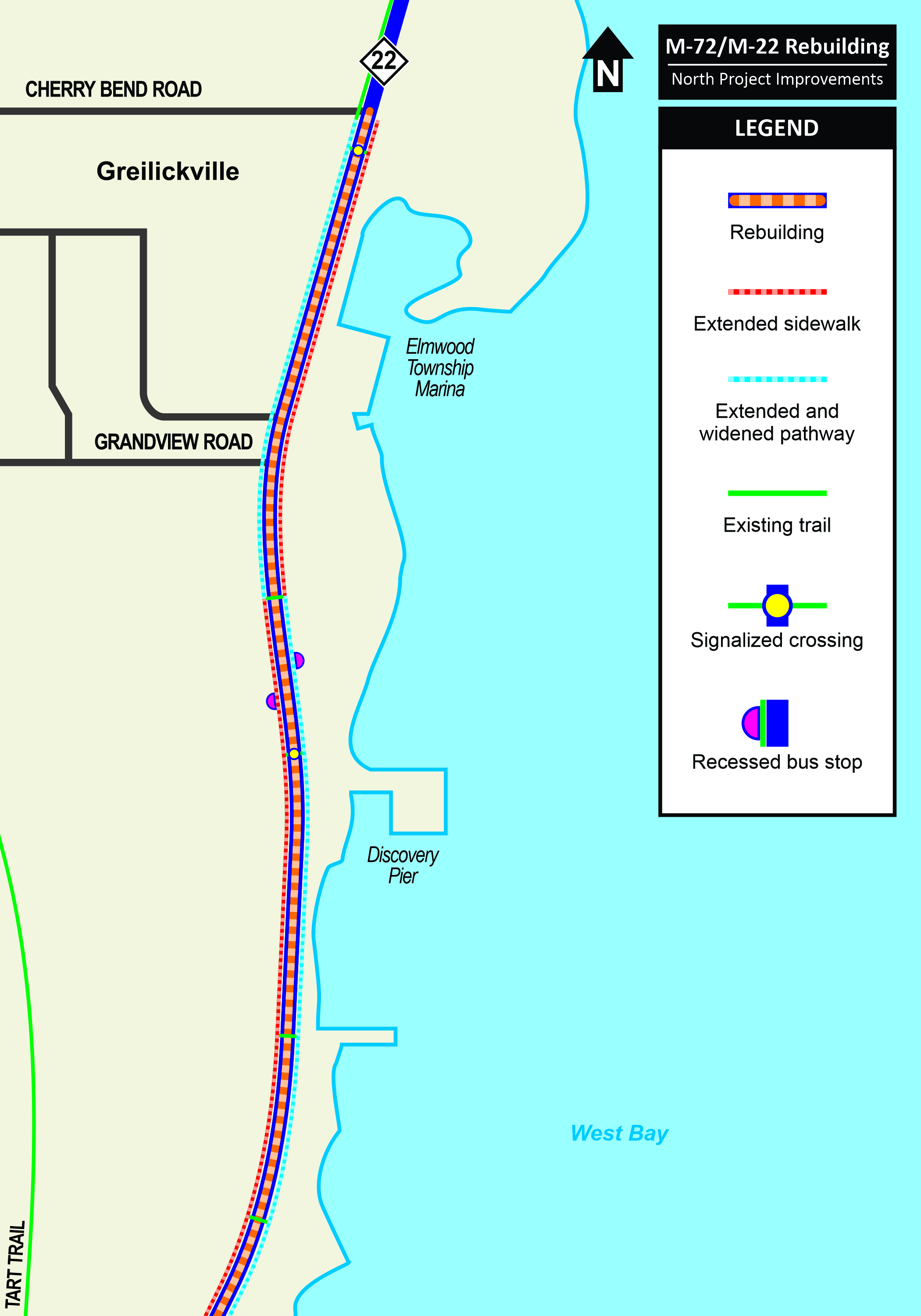 In spring 2025, MDOT began the rebuild of a 2.2-mile section of M-72 (Grandview Parkway) from Division Street in Traverse City and M-22 (Bay Shore Drive) to Cherry Bend Road in Elmwood Township in 2025. The $25.8 million project includes removing the concrete and composite (asphalt over concrete) pavements and restoring the surface condition and ride quality to good condition; drainage improvements, including curb and gutter, storm sewer, culverts; replacing sidewalks and nonmotorized paths; improvements for local transit buses; upgrading sidewalk ramps to Americans with Disabilities Act standards; building a roundabout at the M-72/M-22 intersection that incorporates the Bay Street intersection; Cherry Bend Road traffic signal upgrades; and improving driveway access management where possible.