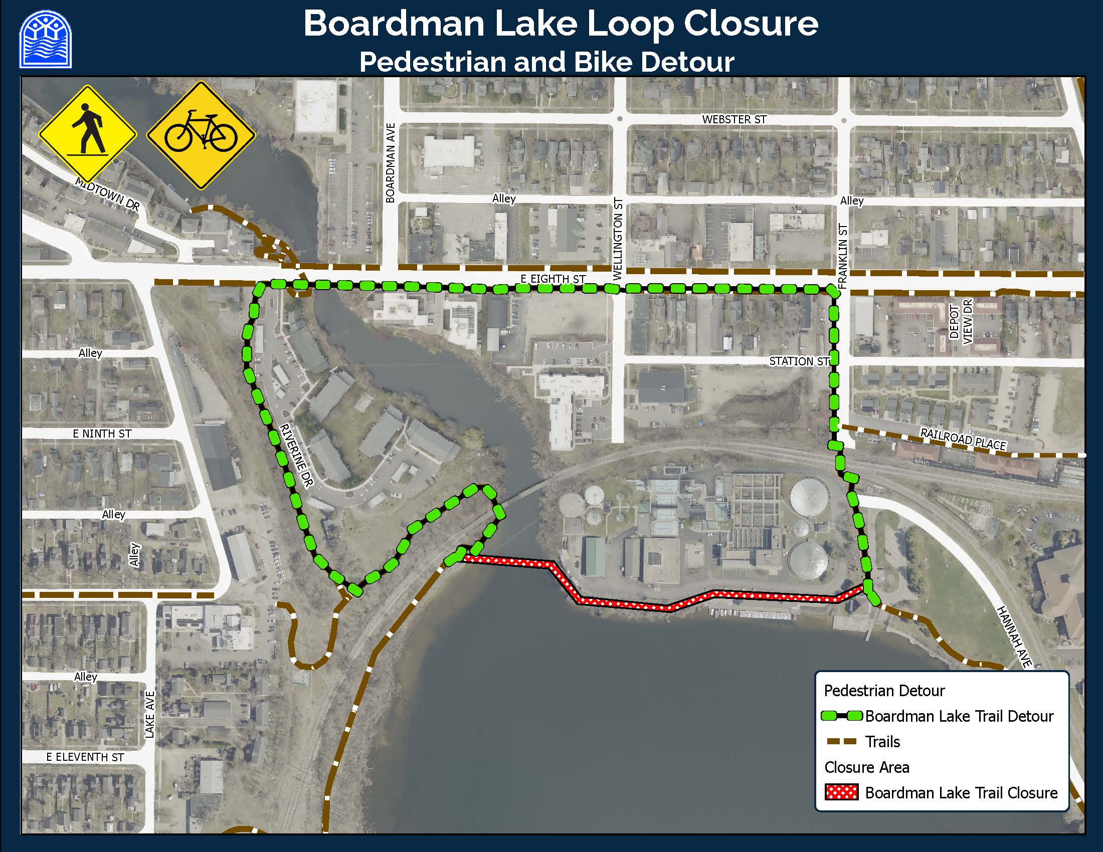 Pedestrians and bicyclists should be aware that the City will close a portion of the Boardman Lake Loop Trail solar installation at the Hull Park Boathouse facility. The trail will be closed at the Hull Park pedestrian bridge to the restroom at Hull Park on Wednesday, November 5, 2025 though November 14, 2025, weather permitting.